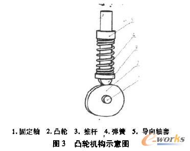以弹簧封闭型弹簧机构为例来说明基于关联设计进行弹簧动画模拟方法。凸轮机构如图3所示,在凸轮绕着固定轴旋转时,推动推杆作上下往复运动,弹簧保证推杆与凸轮接触。