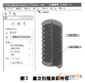 用扫描法生成螺旋曲面,利用其边线为扫描路径建立弹簧模型,该弹簧的高度取决于作为路径草图中直线的长度,改变该直线的长度就可以实现弹簧的伸缩。利用草图的关联设计来改变决定弹簧高度的直线的长度,实现了压缩弹簧的动画制作。该方法稍加改变就可以实现拉伸弹簧的动画制作。