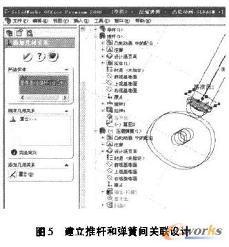 为了实现关联设计,首先在装配体环境中选择推杆,单击装配体工具栏上的"编辑零件"按钮,选择推杆挡圈的端面,以平行距离建立参考基准面,此段距离与建立弹簧端面磨平时建立参考基准面的距离相等,如图4所示。退出编辑零件,选择弹簧,再进人编辑零件,从弹簧特征树中选择曲面-扫描1/草图2,右键单击,从菜单中选择编辑草图.选择草图2直线中不与原点重合的端点,从工具栏中单击添加几何关系,再从特征树中选择推杆中的基准面1,对二者建立重合的几何关系,完成关联设计中的关系设置,如图5所示。这样,当推杆沿轴线运动时,影响弹簧有效圈数部分的草图2中的直线长度就会随着改变,通过模型重建,从而实现弹簧变形动画。