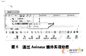 二是利用Animator动画插件来实现。对于本例而言,设置凸轮和固定轴之间的右视基准面成一定角度配合关系。然后在动画中改变该角度值.从而实现整个机构的动画模拟,如图6所示。