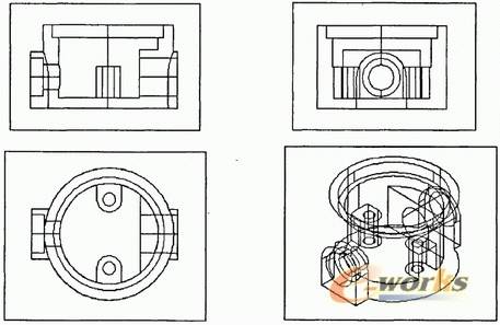 通过SOLVIEW 命令创建出俯视图、主视图、左视图、剖视图等之后,用SOLVIEW 命令创建视口中表示实体轮廓的可见线及隐藏线。在执行SOLVIEW 命令之后,在"选择对象"提示下,可以直接选择预绘图的视口,也可以直接输入ALL,以选择全部视口。选定视口中的所有轮廓圈和剖视图都将被删除,然后由SOLVIEW 命令创建视口中表示实体轮廓的可见线及隐藏线,并投影到垂直视图方向的平面上。
