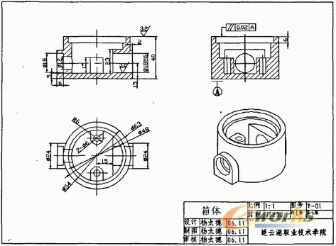 设定尺寸标注样式,在俯视图、主视图、左视图处双击分别激活各个视图,在相应视图的DIM层进行尺寸标注。绘制图框,插入标题栏图块,关闭VPORTS 图层,使布局空间只显示视图,矩形视图外框不再显示,整理后的箱体零件图如4所示。