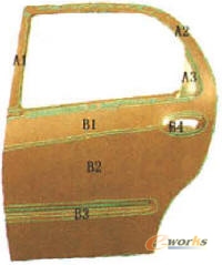对点云进行三角化网格( Mesh Creation) 显示,可以清晰看出被测物休的基本曲面和过渡曲面的构成状况,同时还可以应用根据曲率标准分块工具(Segmentation by Curvature Criterion) 对曲面点云进行分块。图3所示是应用曲率标准分块土具显示的车门三角化网格分块情况,图中车门被分成A、B两大部分,A部分基本曲面为A1、A2和A3,B部分基本曲面为B1、B2、B3和B4,它们都是曲率变化较小、轮廓清晰的大曲面,而且它们之间的过渡曲面的曲率变化较大,它们共同组合在一起构成了车门的主要曲面形状。