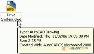 能自动识别出创建该DWG?文件的Autodesk?的软件产品,并自动选用合适的软件打开以保持文件的原有关联。当用户的鼠标指向DWG文件图标的时候,鼠标旁边会出现一个小窗口显示出创建该DWG文件的相关软件的相关信息。