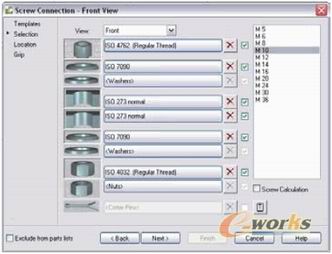 AutoCAD Mechanical支持上千种螺纹联接和自动创建并管理螺纹数据,用户还能够直观看到所有种类螺纹的图样,并容易地选出最合适的设计类型。可以一次性设计所有的紧固件,包括创建,复制和编辑操作。需要做的只是选出所需的螺纹以及相应的垫圈和螺母,软件就能根据螺纹类型和被连接零件的厚度显示出它们合适的尺寸。然后再指定紧固件的放置位置,设计就完成了。物料清单(BOM)会立即获取所有已插入零件的数据。