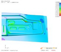 LS-DYNA可用于板成形分析使用的单元有11种。用于板料成形的材料模式是各种弹塑性材料,可考虑各向异性、强化特征,强化类型包括指数强化、随动强化、等向强化、混合强化以及应变率对材料强化的影响。在DYNA30余种接触类型中,适于板成形分析的有12种,都采用罚函数方法(penalty),在接触计算过程中考虑壳单元厚度及其变化。进行板成形分析时可选择使用3D adaptive mesh功能,可在计算过程中对板料网格进行局部加密。