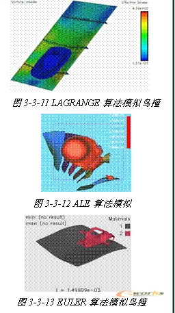 LAGRANGE或ALE的变形能力很大,足以描述与结构分离前的变形;EULER单元可正确描述任意程度的变形;SPH算法可准确描述飞鸟的解体和碎裂。