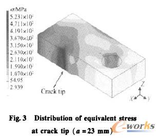 当裂纹长度α为23 mm,则a/W=0.575 , Kic=61.1 MPa·m1/2,利用式(2)及式(3)计算得到Fl=19678. 5 N,下标L表示纵向。MARC程序求得纵向断裂的J积分值为27.71 MPa·mm,裂纹尖端等效应力如图3所示,由式(1)计算得出纵向应力强度因子为60. 46 MPa·m1/2。