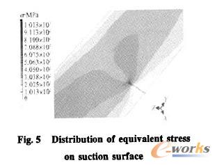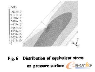 图5及图6给出了1号试验件裂纹尖端等效应力分布,表4则为试验件断裂韧性的计算结果。从表中数据看,叶片断裂韧性存在一定的分散性。2个发生断裂叶片的Kic值,较大的与材料指标接近,另一个则明显低于材料指标。故障叶片的K}。值偏低可能是导致叶片临界裂纹长度a。值较低的一个重要因素。