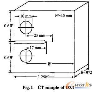 首先,选取紧凑拉伸试验件,按照标准试验方法进行了DZ4材料断裂韧性的测试,试验件结构尺寸如图1所示。表1给出了DZ4材料紧凑拉伸试验件的断裂韧性值(L表示纵向,T表示横向),表2为相关的材料数据。