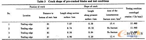 为评估工作条件下叶片发生瞬断时的状态,开展了预置裂纹叶片的破坏试验研究,裂纹形式及试验条件见表30预置裂纹叶片的破坏为典型的I型断裂问题,考虑到DZ4材料属高强度高温合金,以及断裂叶片在断口上所呈现出的脆性断裂特征,采用前面的方法计算出预置裂纹叶片的I积分,进而求出应力强度因子,以此分析叶片的断裂特征。