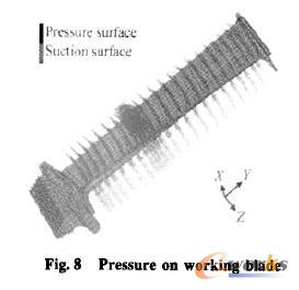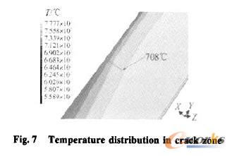 故障叶片裂纹距桦槽底部81 mm,位于排气边,其叶背裂纹长7. 54 mm,叶盆裂纹长为8. 12 mm,叶片瞬断时发动机处于最大转速11 212 r/min,叶片所承受的气动和温度负荷按发动机设计状态给出,见图7及图8,裂纹尖端处的温度在708℃左右。