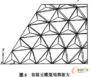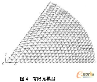 利用Ansys建立本网壳结构模型。定义单元类型、设置实常数、创建模型、施加预应力、施加约束、施加荷载、求解、查看后处理结果有限元模型见图4、图5。