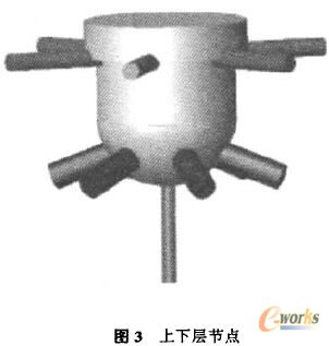 上下层节点由半球形主体和节点盖构成,在该半球形主体的平面端边缘均布有数个拉索连接槽,在该半球形主体的球面设有数个压杆连接螺孔,如图3所示。支座节点采用活动铰支座。