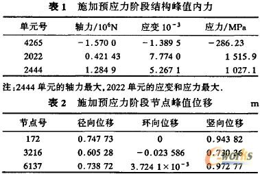 ⑥在第一加载阶段,结构的最大竖向位移为0.972 77 m(向上)。在第二加载阶段,结构的最大竖向位移为-1.662 9 m(向下),为跨度的1/180,小于规范对结构位移的限制;