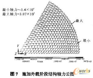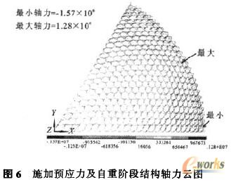 为初步了解此结构的受力状况,先进行粗略的试设计。将所有拉索定义为同一截面;所有压杆定义为同一截面。先只对结构施加预应力及自重荷载,查看后处理结果得到各杆件的轴力;再将屋面荷载施加到各节点上,查看后处理结果得到各杆件的轴力。将这两组轴力进行对比分析,得:(1)由于此结构的对称性,相应的轴力也呈对称分布;(2)结构在预应力及自重荷载作用下,上下层拉索轴力分布较均匀,竖向拉索轴力相对较大,压杆轴力分布也较均匀;(3)上层径向拉索在外载作用下,均为卸载构件,有的已产生负应变,轴力为0,这是设计中禁止产生的,需调整环向拉索距离顶点较远的外环为增载构件,距离顶点较近的内环为卸载构件。中心节点到上层节点的外环压杆为卸载杆件,内环压杆为增载杆件;(4)下层径向拉索在外载作用下,有卸载构件也有增载构件环向拉索外环为增载构件,内环为卸载构件。中心节点到下层节点的外环压杆为卸载杆件,内环压杆为增载杆件;(5)竖向拉索在外载作用下,外环竖索为卸载构件,内环竖索为增载构件。
