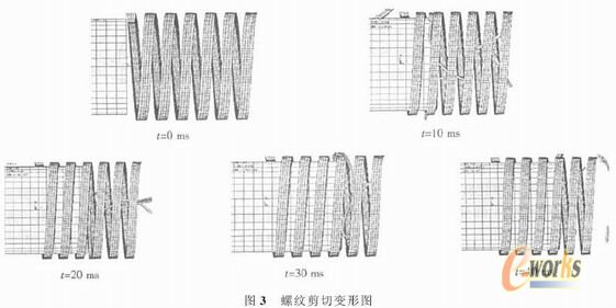 图3是螺纹剪切过程中不同时刻的变形图,整个过程历时0.04s。随着时间的增加,螺纹逐渐被剪切,但剪切力(碰撞力)基本保持不变。由动画演示观察可知,碰撞过程中产生了螺纹铁屑的散落,如果散落位置不合理,可能导致铁屑的重复剪切或摩擦,对模拟仿真结果带来一定干扰。