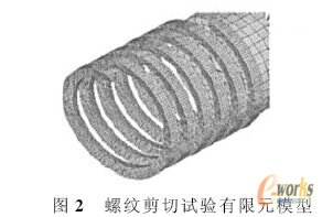 选用ANSYS/LS-DYNA中的二维显式实体单元SOLID164建立仿真模刑。该模型由2部分组成:一是螺纹管(内螺纹)一是螺纹杆(相当于碰撞过程中的固定刚性墙)。模型采用弹塑性材料,50#。单片剪切模型共有30180个SOLID164单元、53 309个节点(见图2)。