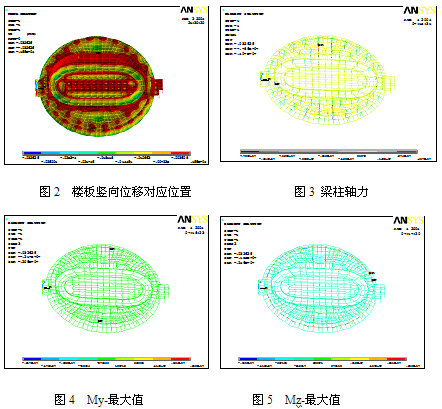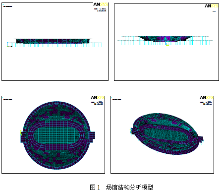 一层包括正对主场馆直径132m的圆盘下方、东侧扩展为矩形的群房及向北延伸的单层条形部分,本层集中了除赛场以外的绝大部分管理、接待、办公、休息、技术支持、设备机房及交通辅助部分。二层是马鞍形主赛场,中间为内场及环绕内场的木质赛道。在赛场7.5米标高处设置有环形的休息大厅,休息大厅周边均匀地布置了作为赛场垂直交通枢纽的楼梯、电梯、卫生间等用房。该场馆平面近似椭圆,长轴144米,短轴130米,总高度13.04米。规模较大,结构复杂,用一般的软件很难得到满意的结果,为此使用了大型结构分析软件——ANSYS8.0对建筑结构进行了合理的建模,并对其进行了静力和模态分析,在静力分析中进行了各种荷载组合,得出了梁、柱、墙、板等构件的变形、轴力、弯矩等结果,提出了该结构的薄弱构件,对结构设计有一定的参考价值;并得出了该结构的前40阶频率和振型,并对振型特点进行了分析。