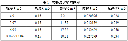 (1) 由表1可知,由于板厚适宜(0.15米),柔度适中,板的一般竖向位移为0.025米左右,在标高为6.95米处的跨度较大,竖向位移稍大,为0.032629米,达到规范的要求。