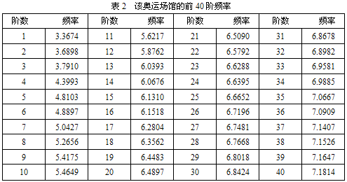 由于该奥运场馆是典型的三维空间结构,频率较密集,振型较多,经反复试算后,取结构前40个自振频率和振型(表2)。