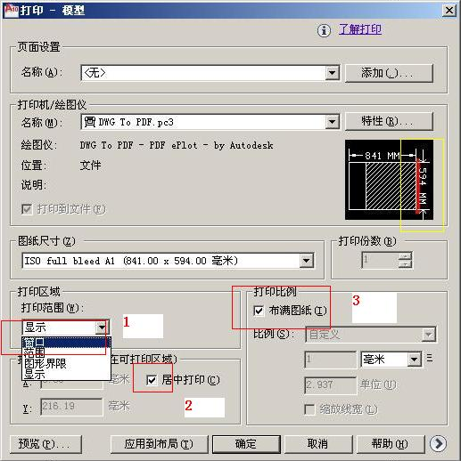 第五步,1设置打印区域 2居中打印 3布满(注意,如果图片不能布满图纸,请旋转一下你的文件90度)