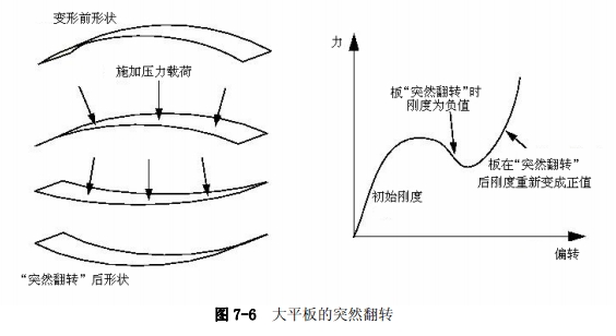 可以预料大挠度和转动对结构承载方式有重要影响。然而,并非位移相对于结构尺寸很大时,几何非线性才显得重要。考虑一块很大的弯板在所受压力下的“突然翻转”现象,如图7-6所示。