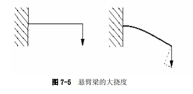 例如,考虑端部受竖向载荷的悬臂梁(见图 7-5 )。若端部挠度较小,分析时可以认为是近似线性的。然而若端部的挠度较大,结构的形状乃至于其刚度都会发生改变。另外,若载荷不能保持与梁垂直,载荷对结构的作用将发生明显的改变。当悬臂梁自由端部挠曲时,载荷可以分解为一个垂直于梁的分量和另一个沿梁的长度方向作用的分量。所有这些效应都会对悬臂梁的非线性响应作出贡献 (也就是梁的刚度随它所承受载荷的增加而不断变化)。