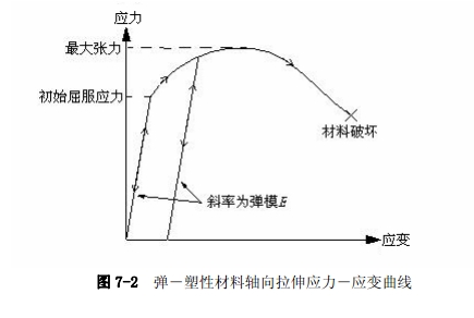 这种非线性也许是人们最熟悉的。大多数金属在小应变时都具有良好的线性应力/应变关系,但在应变较大时材料会发生屈服,此时材料的响应变成了非线性和不可逆的(见图7-2)。