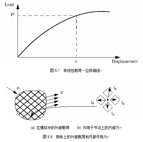 关于结构的非线性载荷-位移曲线,如图8-7所示,分析的目标是确定其响应。考虑作用在物体上的外部力P和内部(节点)力I,(分别见图8-8 (a)和图8-8 (b))。由包含一个节点的各个单元中的应力引起了作用于该节点上的内部力。