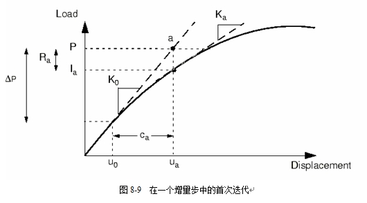 对于一个小的载荷增量DP,结构的非线性响应如图8-9所示。ABAQUS/Standard应用基于结构初始构形u0的结构初始刚度K0,和DP计算关于结构的位移修正值(displacement correction)ca。利用ca将结构的构形更新为ua。