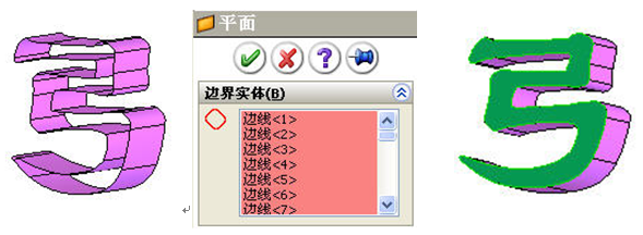 由一个 2D 草图或者由零件上的一个封闭环(必须在同一个平面上),生成一个有限边界组成的平面表面。