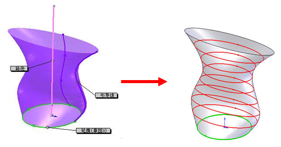 路径控制扫描的方向,引导线控制扫描过程中各截面的形状和尺寸。(也就 是说曲面的截面在扫描过程中形状随引导线的变化而变化)