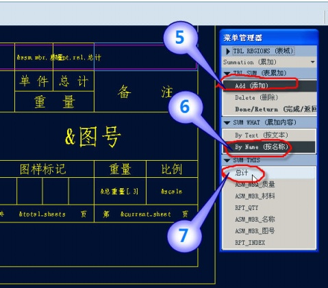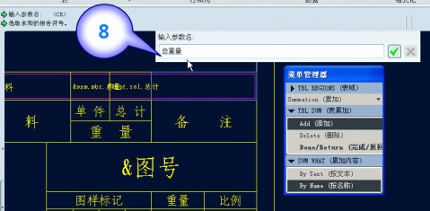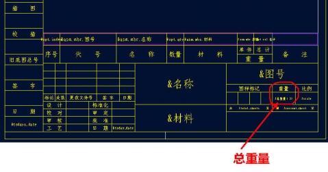 最后要在标题栏中显示“总重量”的统计结果,可在重量下方的单元格中输入文本“&总重量”的方式提取参数“总重量”的累加结果。