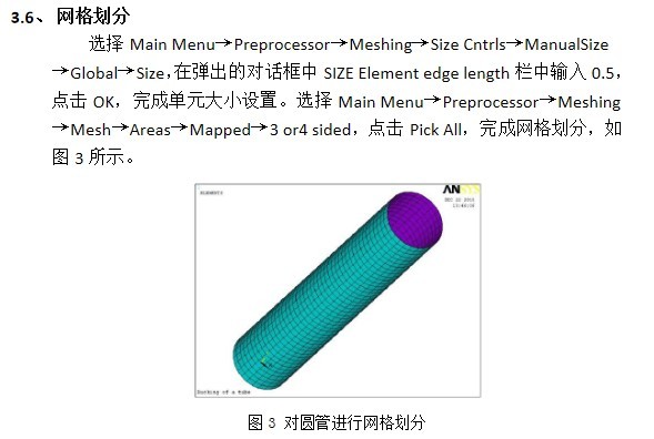 有限元分析的精度和效率与单元的密度和几何形状有密切关系,按照相应的误差准则和网格疏密程度,应该避免网格的畸形,因此,划分网格时,应尽量采用映射网格模式划分。本题中,圆管形状规则,采取映射网格进行划分。