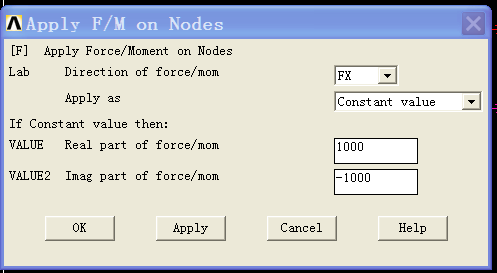 3、施加荷载。注意如果是多个荷载同时作用于结构,必须先设置分析类型才能输入每个荷载的相位角。荷载大小代表振幅,由于是单一荷载,没有必要规定相位角,下图1的VALUE2就没必要输入任何数值。如果是多荷载还要规定相位角,相位角可能通过VALUE2来规定。