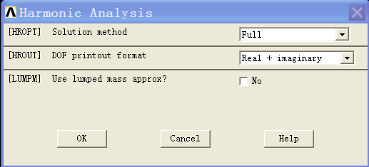 谐响应分析有完整法、缩减法和模态叠加法,ANSYS默认用完整法。各种方法均有各自的特点和适用环境,具体介绍查有关资料。