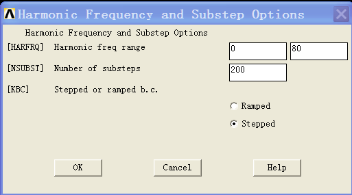 图4中,0表示最低频率,80表示最高频率,因此改分析的频率范围为[0,80];200表示荷载子步数,同时选择荷载施加方式为stepped。