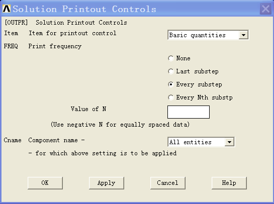(3)选择菜单main menu->solution->losd step opts->output ctrls->solu printout 弹出solution printout controls 对话框,设定输出结果内容和形式如图3。