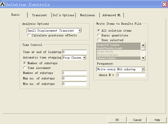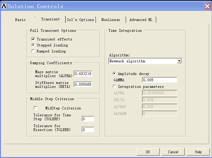 Main menu->solution->sol’n controls,弹出solution controls对话框,在basic选项卡中设定输入结果内容和形式如图2-1所示。在transient选项卡中设定瞬态分析时结构的阻尼如图2-2所示。图2-2的alpha对应的是rayleigh阻尼的质量矩阵的系数,beta对应的是刚度矩阵的系数,这两个系数是由前一步的模态分析经代入相关公式求解得到的。