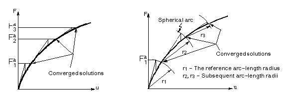 NR 平衡迭代沿一段弧收敛,从而即使当正切刚度矩阵的倾斜为零或负值时,也往往阻止发