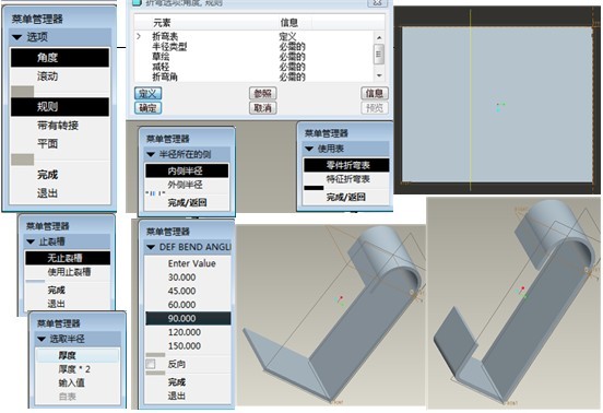 折弯是将钣金件的平面区域弯曲某个角度或者弯曲为圆弧状。在创建折弯特征时,要草绘折弯线,指 定折弯方向,定义折弯角度、折弯半径和止裂槽后,即可建立特征。折弯分为角度折弯和滚动折弯两种类型。在创建折弯时,有 规则折弯、带有过渡的折弯和平面折弯三种折弯选项。