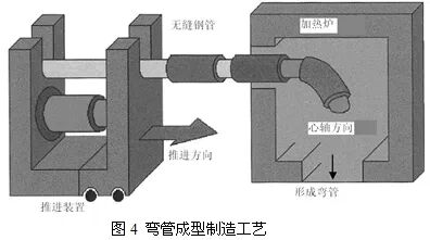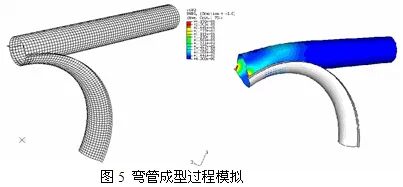 图示结构为弯管成形制造工艺中各种装备相互作用情况的示意图。有限元分析主要针对在内压作用下经过加热的钢管受力发生塑性变形的过程进行研究。图5为ABAQUS对弯管成型过程的模拟。