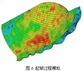 ABAQUS拥有丰富的材料本构模型和单元类型,在处理高度非线性问题方面性能卓越,一直为广大工业和研究客户所信赖。图示为某航空油箱成形过程中起皱现象的仿真模拟。