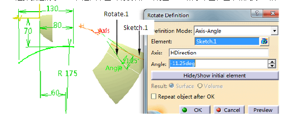 图8-65 Plane.1上的轮廓 图8-66 Sketch.1转动11.25° 如图8-66所示,将Sketch.1绕水平轴线转动11.25°,生成Rotate.1。 单击图标