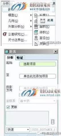 3、点选Pro/ENGINEER“分析”菜单->选择“测量”->选择“距离”,如图3。弹出距离测量对话框,图4。