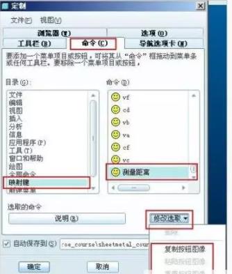 7、可以通过“工具”菜单->选择“定制屏幕”来设置刚才创建的映射键图标,如图8。可以为此映射键“选择按钮图像”或“编辑按钮图像”进行自定义图标,Pro/ENGINEER提供很多按钮图标,如图9只是其中的一部分。完成了图标的设置您可以把该图标拖动到工具条中。