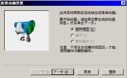 animator提供了动画向导,利用它可以很轻松的制作出模型旋转以及爆炸视图动画。点击工具栏上的动画向导按钮,出现“选择动画类型”对话框,只要按照计算机提示以及帮助,就能很方便的生成旋转及爆炸动画,我就不细讲了,帮助文件讲的比我还详细。
